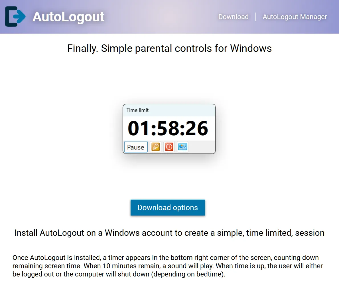 AutoLogout started out as a simple timer for a guest account on a computer I share with younger siblings, but always with the ambition of one day becoming fully fledged parental controls on Windows - which is sorely lacking competent solutions.